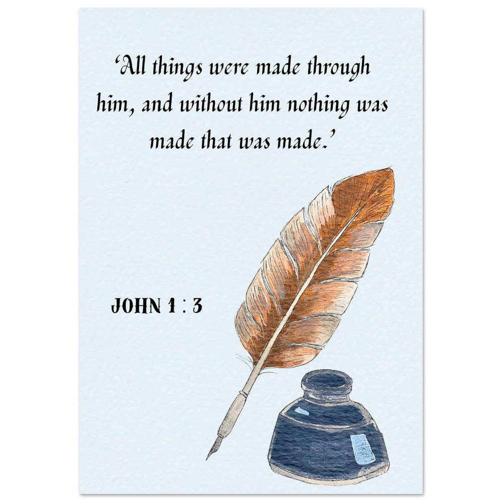 This elegant poster displays a quill and ink pot paired with John 1:3 — “Through Him all things were made.”Symbolizing God as the true author of creation, this piece adds depth and meaning to your home or study space.Experience art that feels silky to the touch with our high-quality, lighter-weight, classic semi-glossy paper: